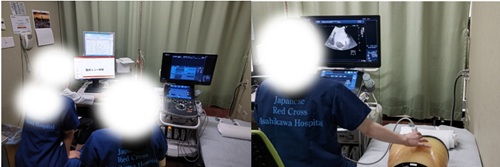 さて、当院の研修医に対するレクチャーは様々ありますが、私が一番楽しみにしていたのはエコー研修でした。とうとう待ちに待ったエコー研修が開始し、技師さんから直接指導していただき、模型だけでなく同期と腹部や胸部を差し出しあって救急外来で使えるようなエコー技術を学んでおります。私自身、学生時代は全くエコーを当てたことがなかったので、急に当てるとなるとプローブの向きすら分からず、何か描出されてもそれが何なのかよくわからないといった感じでした。限られた時間の研修ですが、少人数で開催してくださっていることもあり、分からないことはすぐに質問でき、こんなこともわからんのかと言われてしまいそうな質問に対しても、真摯に技師さんは答えてくれました。本当に感謝しています。2年目でもエコー研修に参加できるとのことだったので、来年もぜひ参加させていただきたいなと思っています。同期に当てさせてもらうと模型では見られない脂肪肝の所見があったりと異常所見もみることができるので、来年は異常所見が改善しているのか、はたまた更に他の所見が出現しているのか、少し楽しみですね。お酒の飲みすぎ、食べ過ぎには気を付けてもらいたいなと思います。