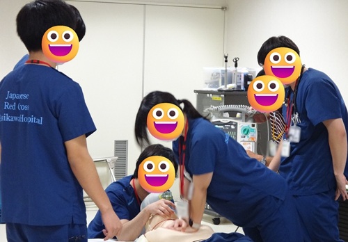 また、旭川赤十字病院では救急対応に関する研修の機会が非常に豊富です。私は6月にICLSコース※1を、8月にJMECC※2を受講させていただきました。ICLSやJMECCでは、心停止時の対応をはじめとする救急初期対応を体系立てて学ぶことができます。シミュレーションを繰り返し行い、実際に胸骨圧迫・気道確保・薬剤投与の手順を体で覚えられるのはとても貴重な経験です。最初はシナリオ通りにすら動けず焦りましたが、何度も練習を重ねるうちに少しずつ動けるようになる感覚を覚え始めています。
